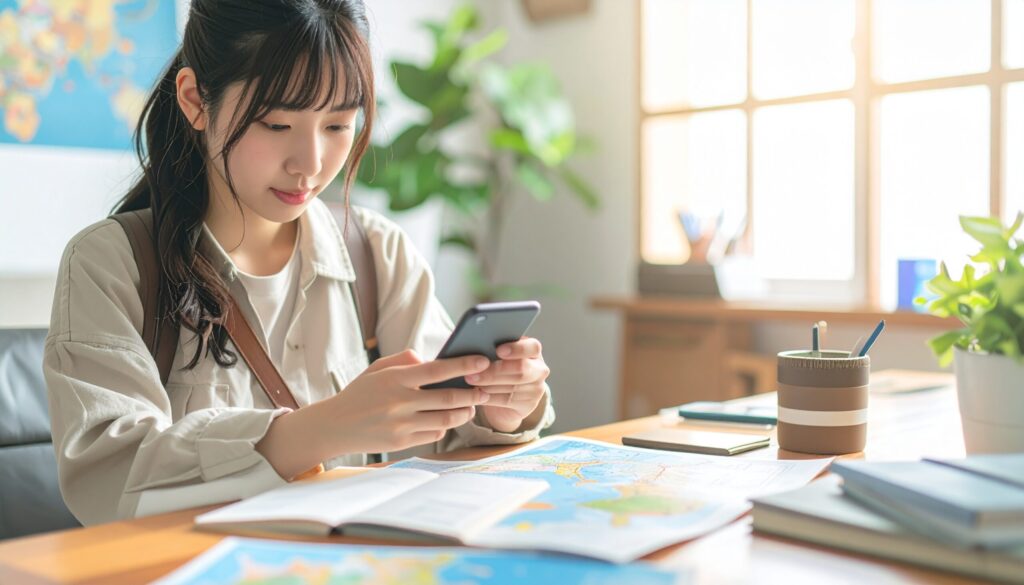 A Japanese traveler preparing for an overseas trip at home, looking at a smartphone and travel documents on a desk, neutral and realistic atmosphere, no brand logos